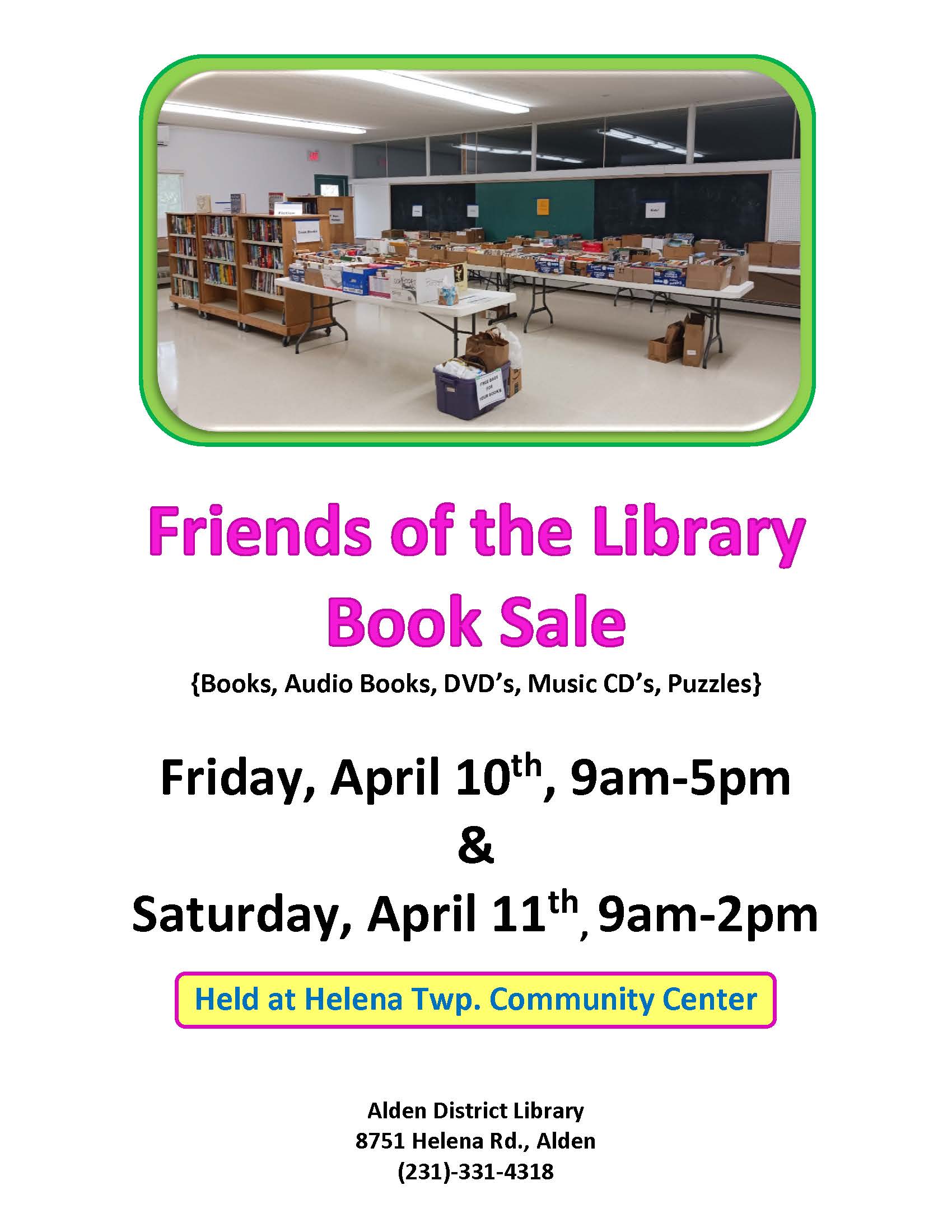 THURSDAY, April 16 th, 9:30am social time & 10am meeting held at Helena Township Community Center, 8751 Helena Rd, Alden. Topics of discussion will be plans for upcoming programs, book sales, and activities. Anyone interested in supporting the library is always welcome. Held at Helena Township Community Center, 8751 Helena Rd, Alden. 231-331-4318. |