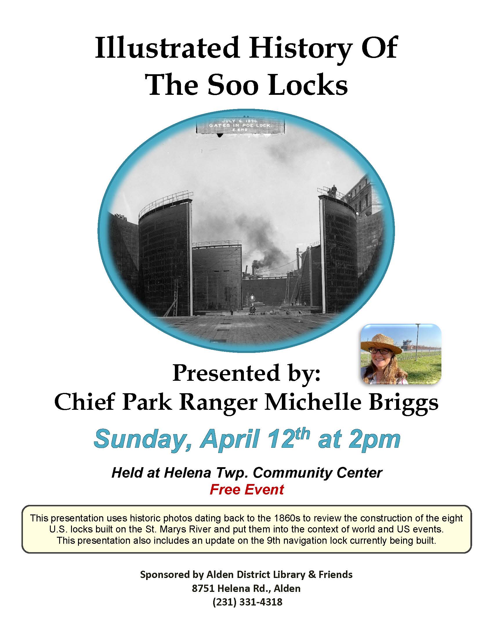 SUNDAY, APRIL 12th, 2pm-3pm. Join us for a deep dive into the history of the Soo Locks with Chief Park Ranger Michelle Briggs. This presentation uses historic photos dating back to the 1860s to review the construction of the eight U.S. locks built on the St. Marys River and put them into the context of […] |