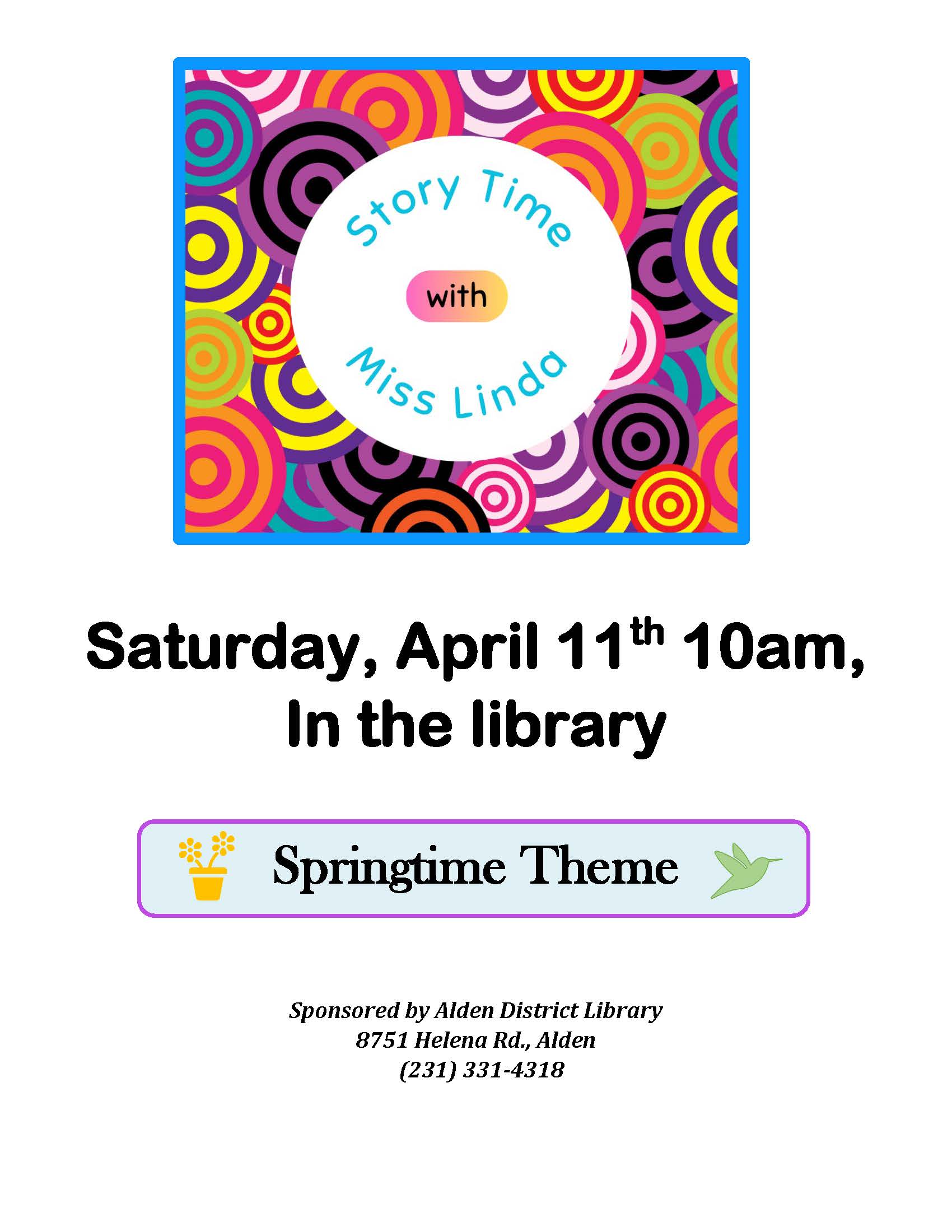 SATURDAY, April 11th, 10am. Miss Linda will be reading stories with a springtime theme and doing simple activities with the kids. This program will be held in the library located at 8751 Helena Rd, Alden, 231-331-4318. |